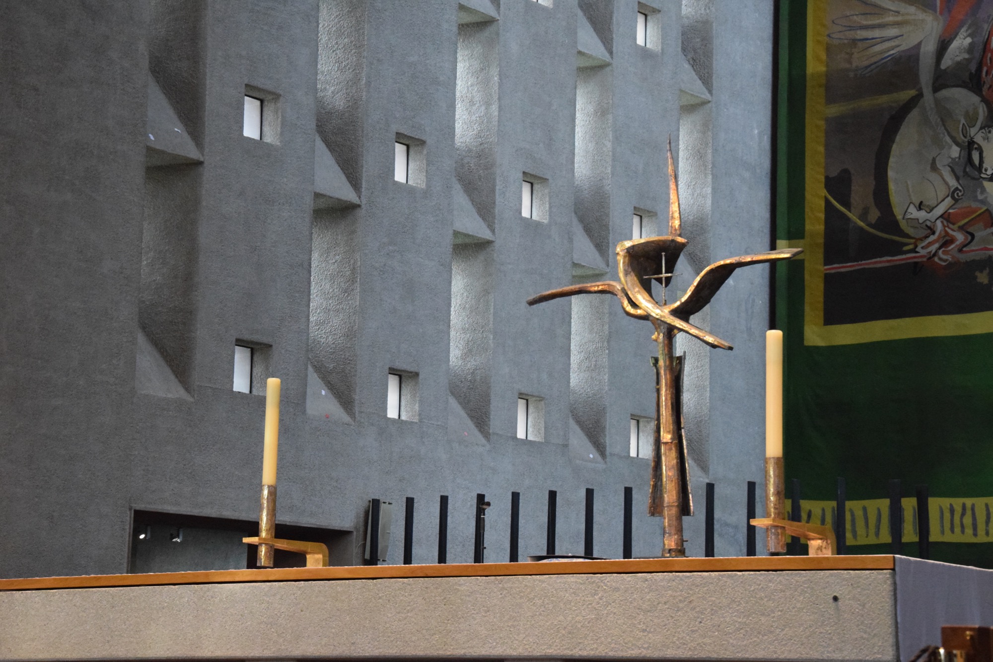 The new building is, I’m pretty sure, unlike any other cathedral in Britain: a cavernous concrete hall, dominated by a huge tapestry of Jesus on the cross. It’s only when you reach the other end that you notice the angled-away floor-to-ceiling windows providing the light (well, unless you turn right, in which case you get blown away by the multicoloured baptistry window, but I didn’t turn right).