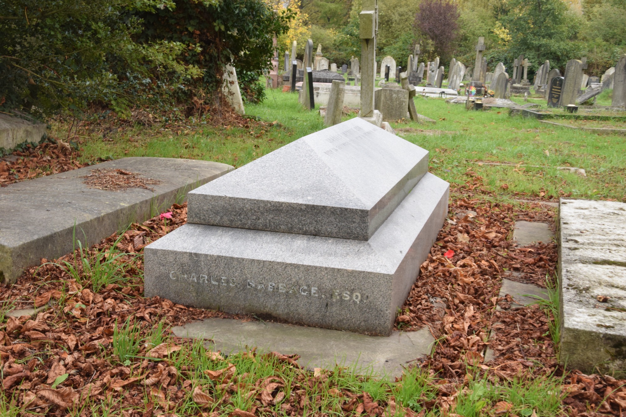 Many famous people are buried here, including a large number of Fellows of the Royal Society. There’s a list on Wikipedia, but I didn’t have time to find more than one: I chose to go see Charles Babbage’s tombstone. One of the FRSes, he’s one of the fathers of computing, along with his lifelong friend, Ada Lovelace. The tomb was, perhaps, simpler than you’d expect for a man of his stature, but then that was true at Père Lachaise as well. When I visited the Parisian cemetery my friend and I spent a couple of fascinating hours seeking out the graves of the great and the good, as a sort of macabre scavenger hunt. Someday I should go back to Kensal Green and do likewise.