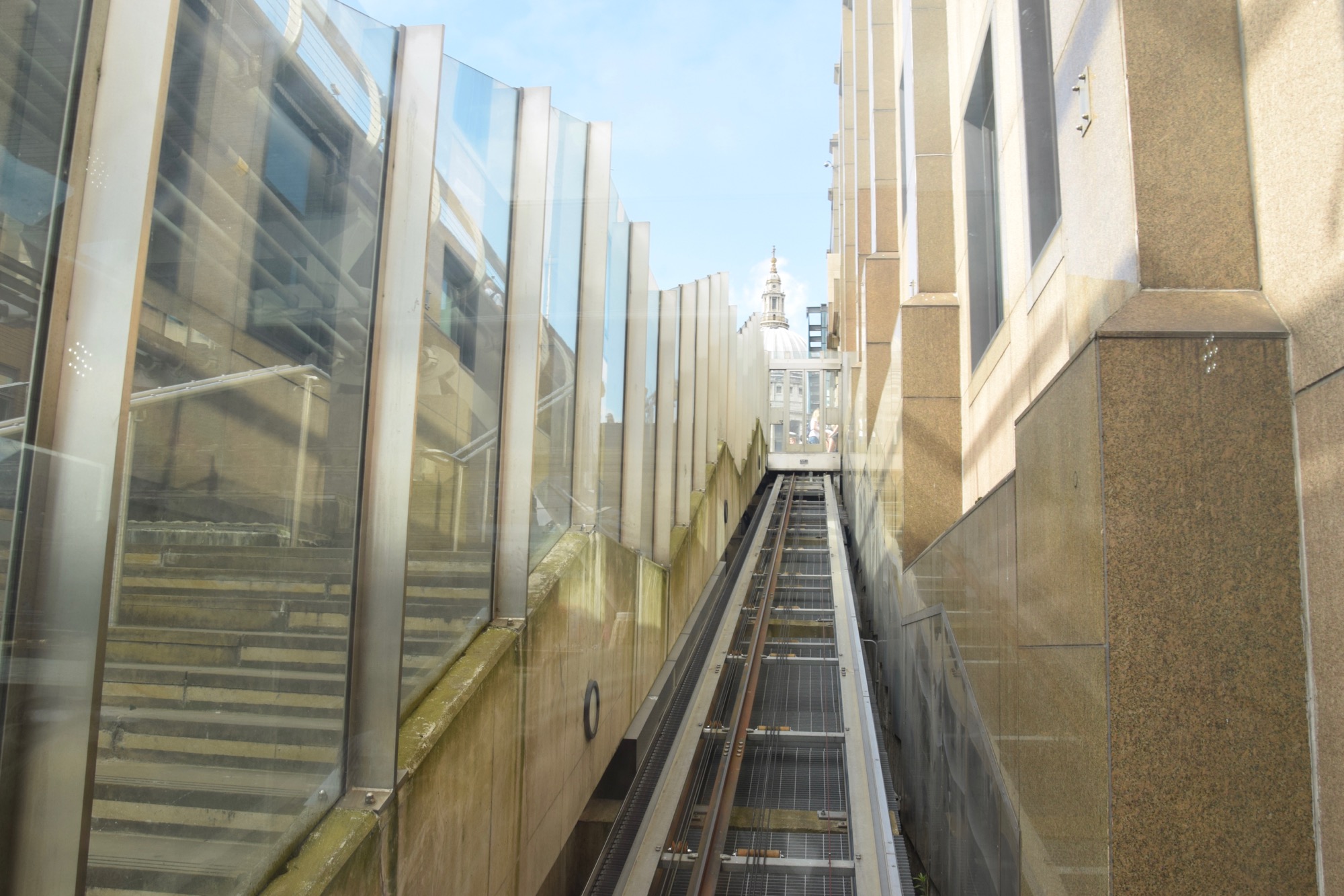 London also has a funicular railway near here: a railway where the carriage runs on sloping rails, and is pulled by a rope at the other end of which is a counterweight.³  Its purpose is to provide an alternative to the steps that lead from the Victoria Embankment to the bridge deck of the Millennium Bridge, most famous for being the wobbly one that they had to close for two years days after it opened so people stopped feeling sick.