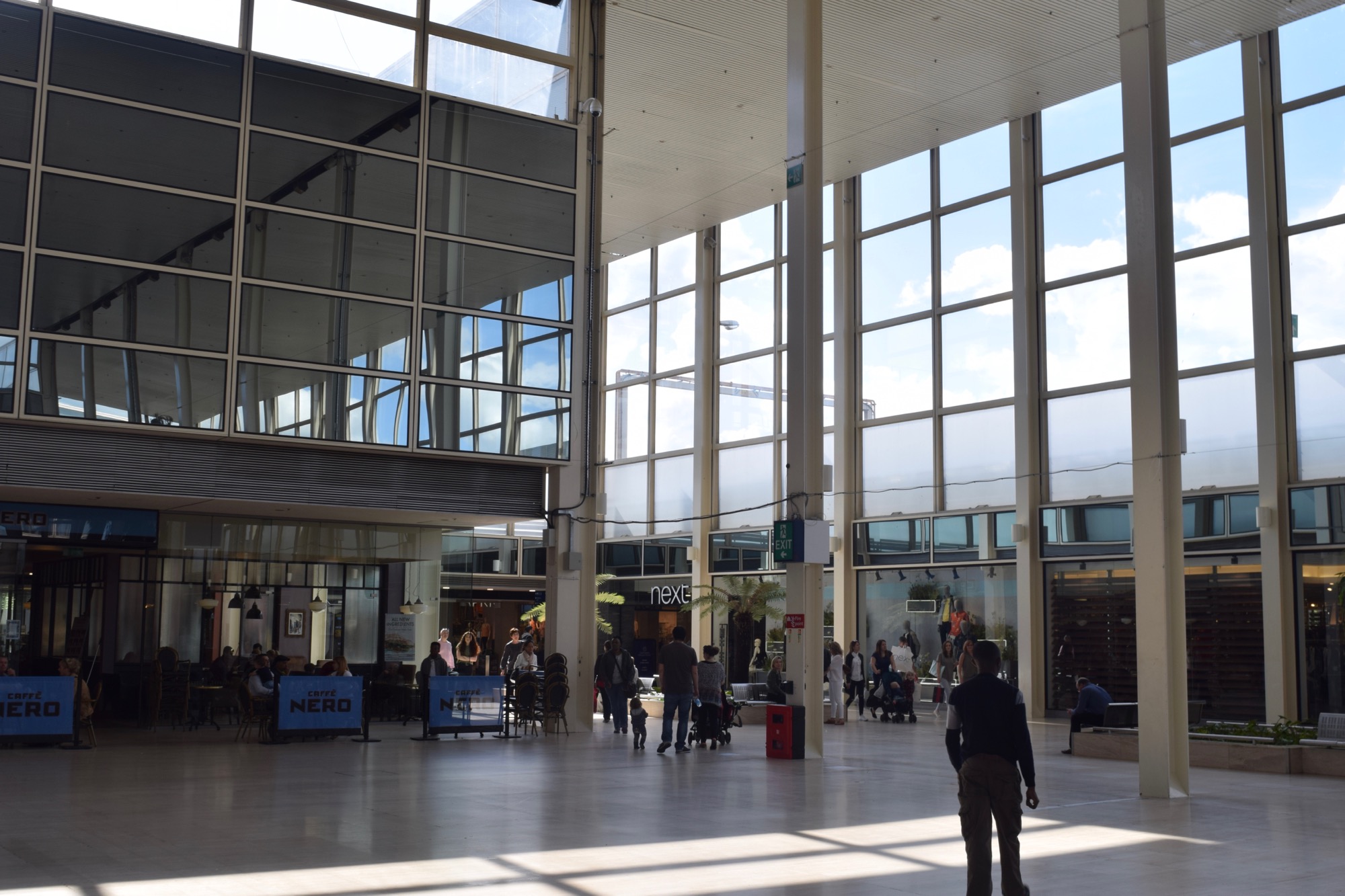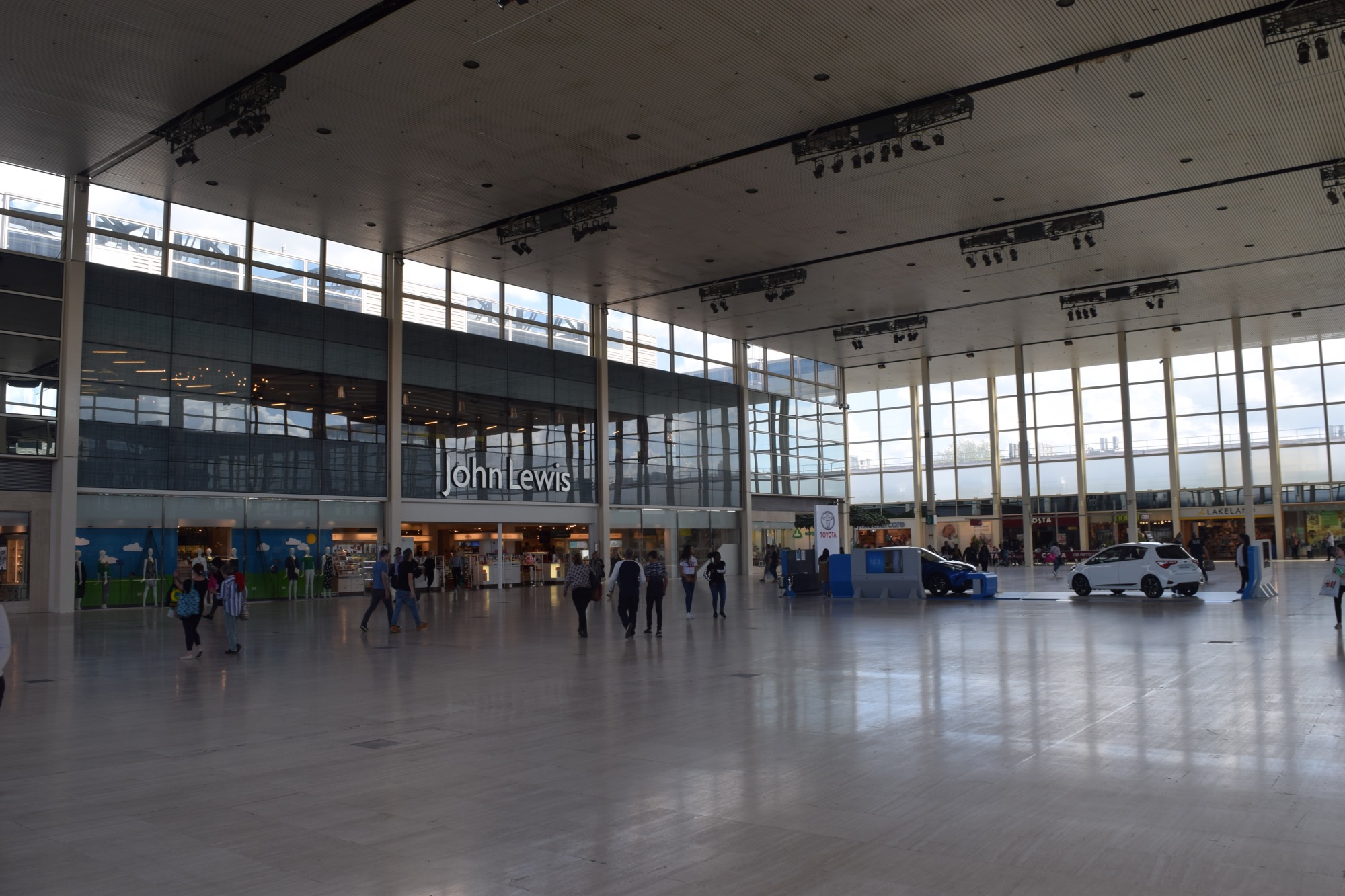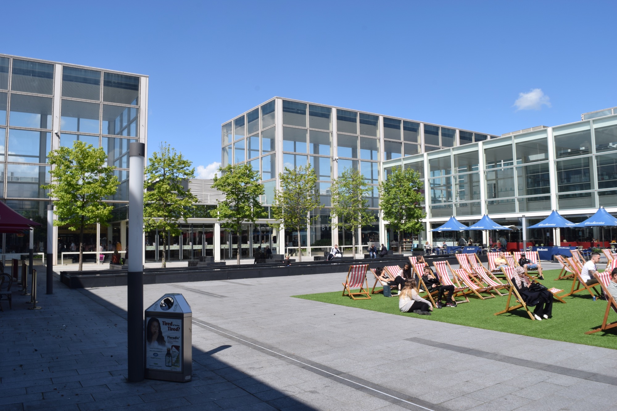 When they built that other shopping centre (Midsummer Place, now called “intu Milton Keynes”), there was a protected oak tree (one of only two Great Oaks in MK), which they couldn’t remove—so they had to build around it, putting it in the middle of a courtyard.  Unfortunately, it didn’t like living in a shopping centre: the drainage was poor, and it drowned.  The courtyard is still there, now sadly bereft of its oak.
