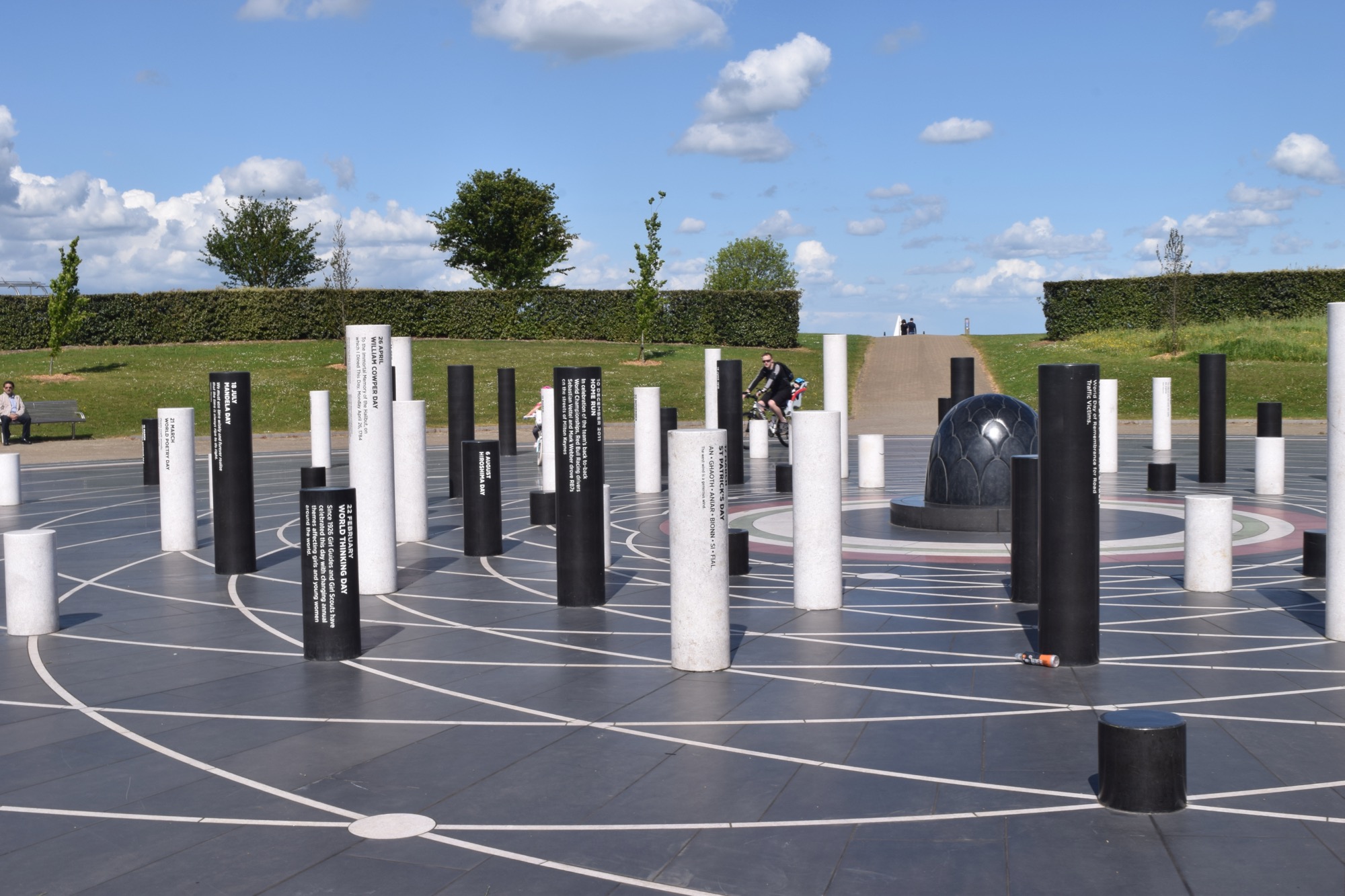 A tiled area with black tiles inset with various white orbit-like rings, on which are set white and black pillars of various heights, with inscriptions of dates and text. The centre of the circular paved area is a pine-cone-like shape, made of black stone, surrounded by rings of coloured paving. There are a few people around. In the background are grassy banks topped by hedges, and a path leading to a metal pyramid. The sky is bright blue with white fluffy clouds.