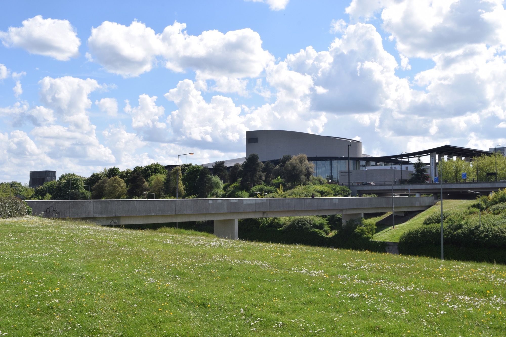 The grid squares all have names for the community contained therein, except that two of the central ones are one district, known, imaginatively, as “Central Milton Keynes”, or CMK, or just the city centre.²  This is not a city centre in the conventional sense, in that the shops are almost entirely contained in two shopping centres.  The older of these, now called “Centre:MK”, has actually quite an innovative design, with huge arcades (and a giant hall at one end), and with service roads all placed above the shops (accessible straight from one of the V-roads) so that delivery vehicles don’t get in the way of shoppers.  It was considered such a good piece of architecture, in fact, that it was listed, although the owners weren’t happy about this.